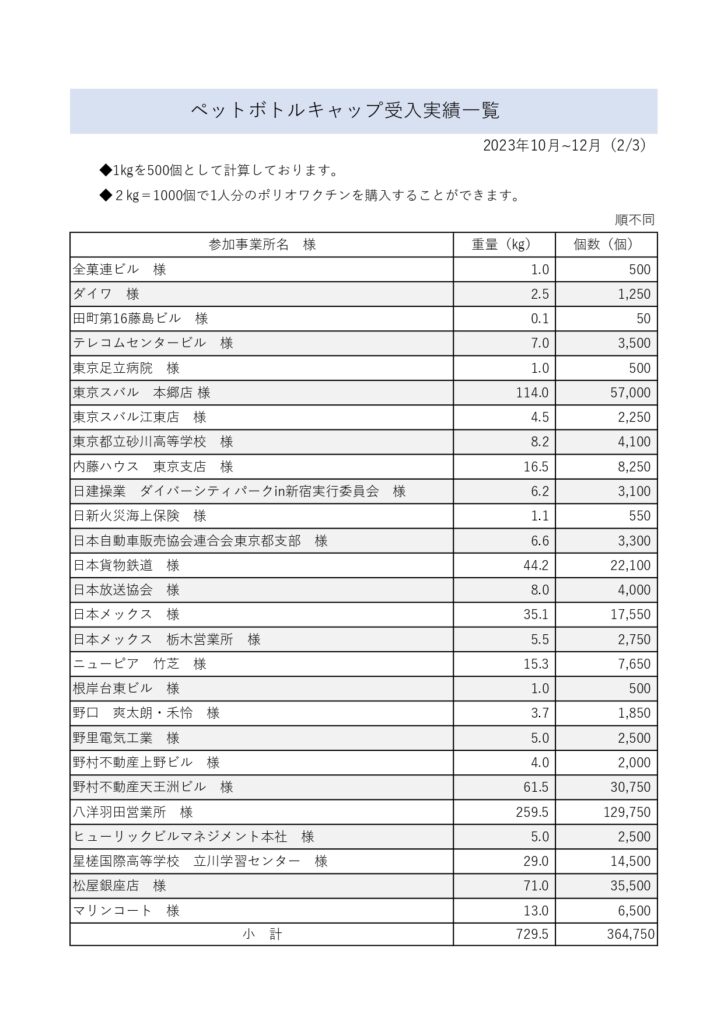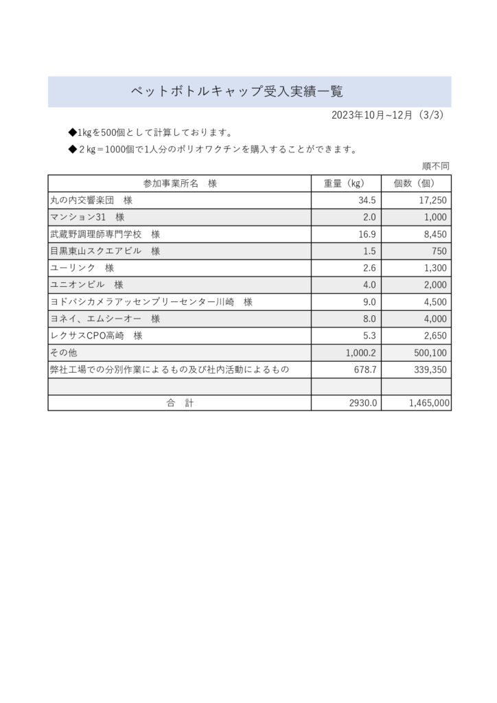 2023年10月~12月のペットボトルキャップの受入実績