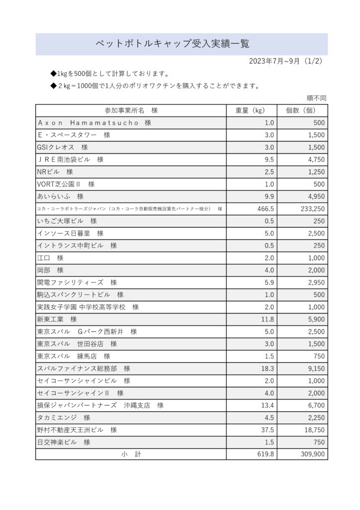 2023年7月~9月のペットボトルキャップの受入実績