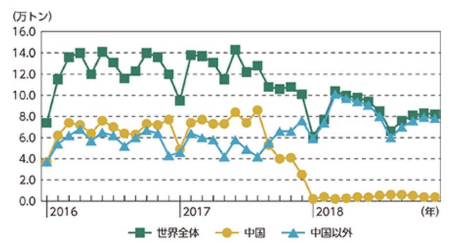 マテリアルリサイクルしている割合は約24%で、このうち約74%は海外に輸出されています。一方で中国などでは、プラスチック廃棄物の輸入規制が強化されてきている事実もあります。