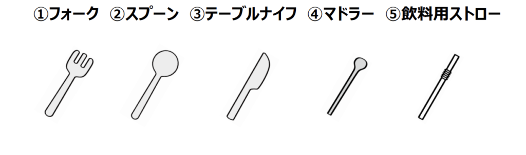 フォークやスプーンなど12種類が特定プラスチック使用製品に指定され、削減することが求められます。対象となる業種は、各種小売業、飲食店、宿泊業、洗濯業などです。