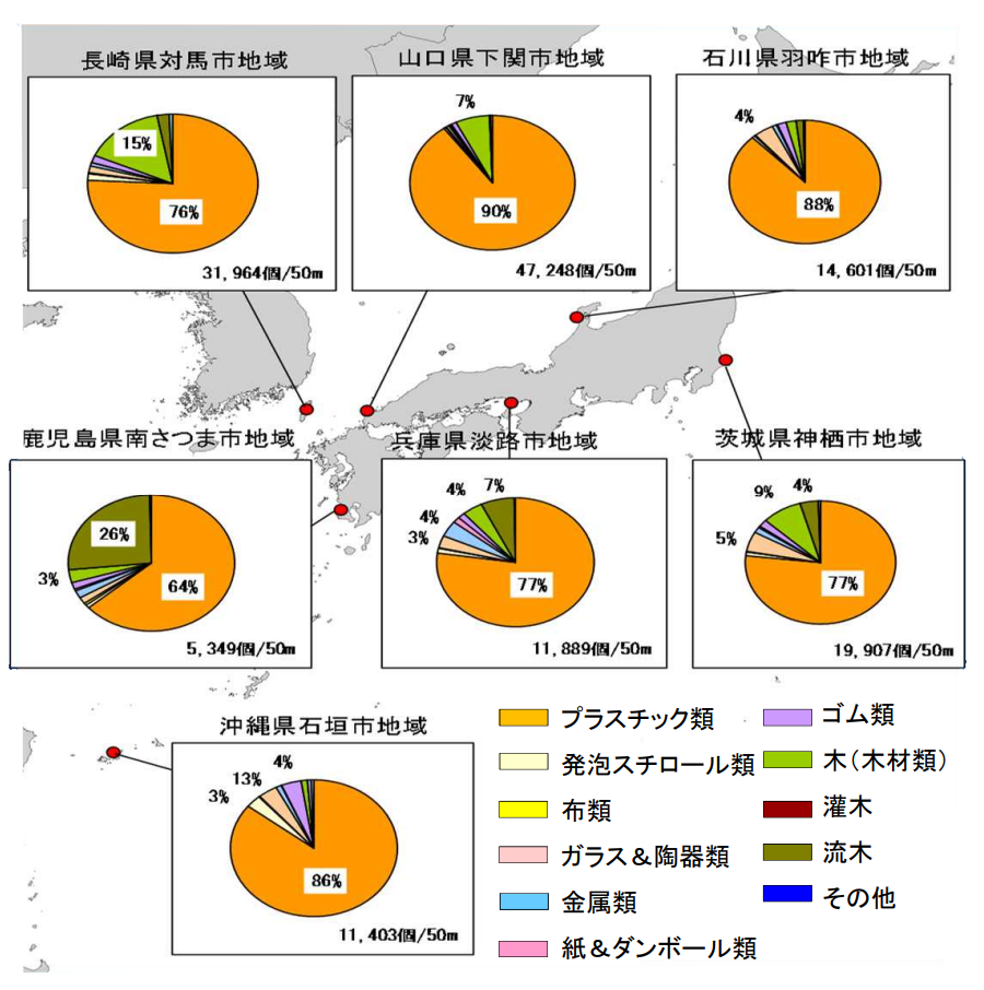 環境省の調査では、長崎県下関地域の海岸への漂着ごみの90%がプラスチックとなっています(2010~2014年合計)。