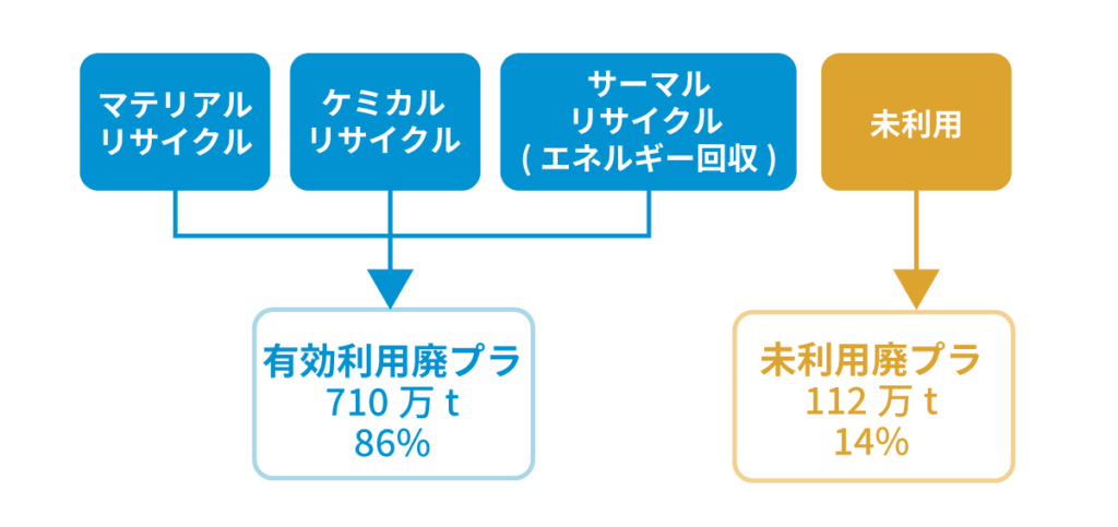資源として収集された一般系廃プラスチックや産業系廃プラスチックは、一部は埋め立てられたり、単純焼却されたりしますが、その多くはリサイクルされます。プラスチック循環利用協会の調査によると、2020年の廃プラスチックの有効利用率は86%となっています。