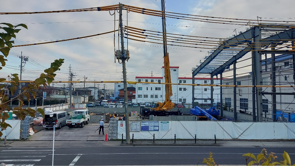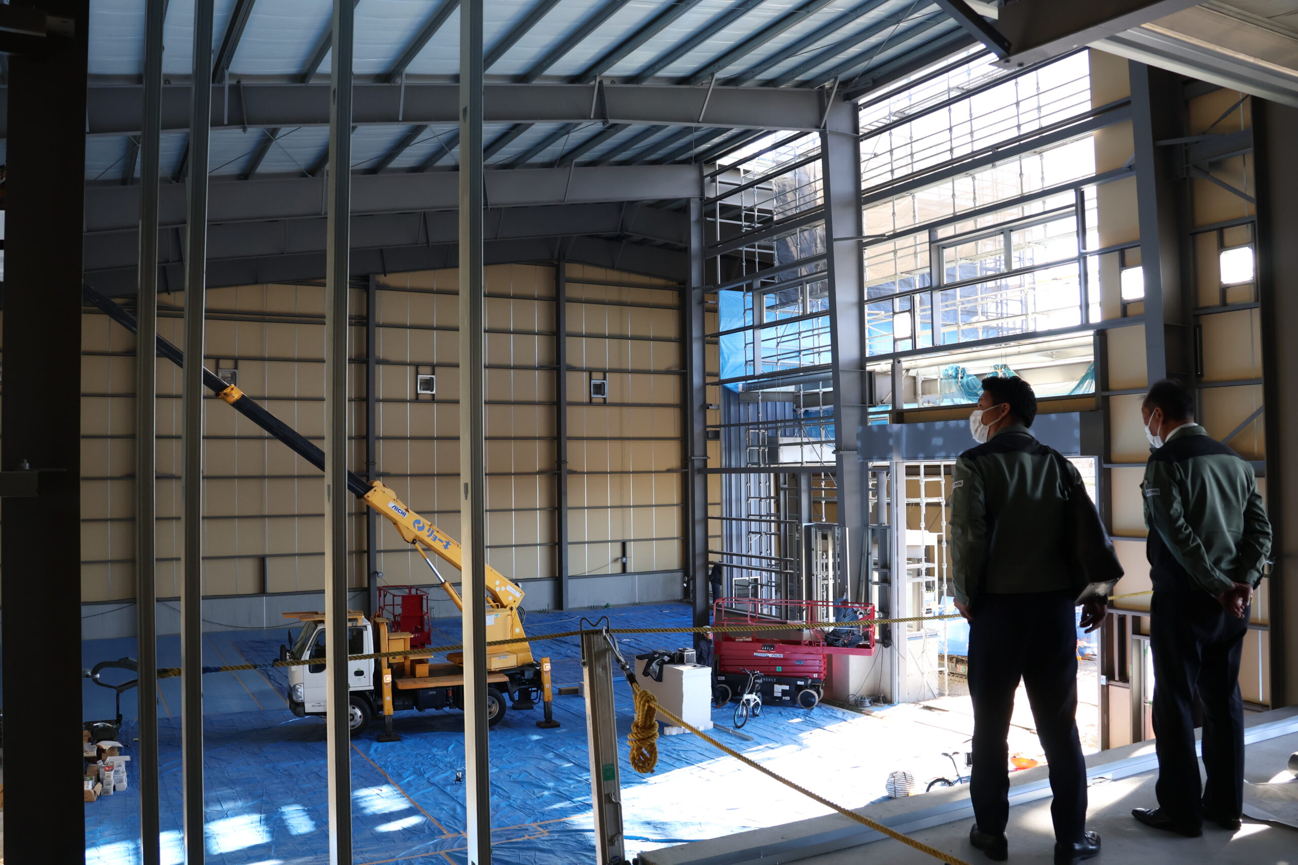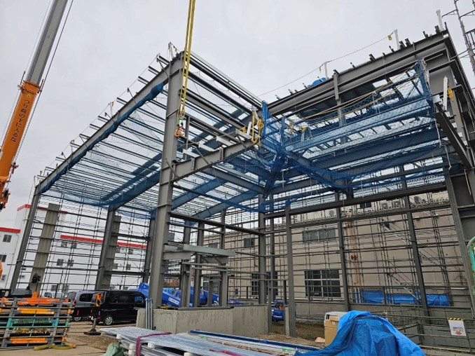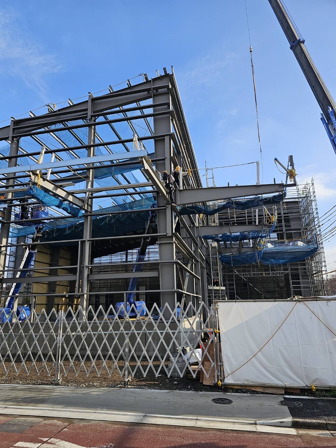 12月15日の棟上げ以降、屋根や壁ができ、建物全体が覆われています。冬の青空がきれいです。