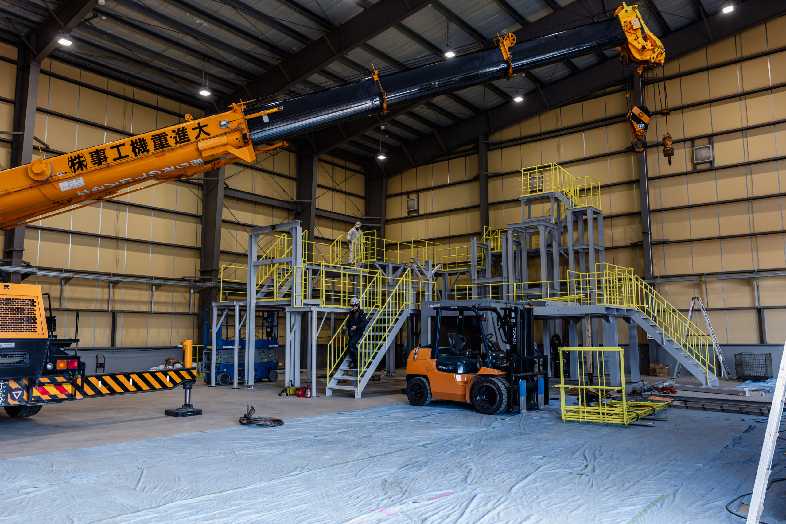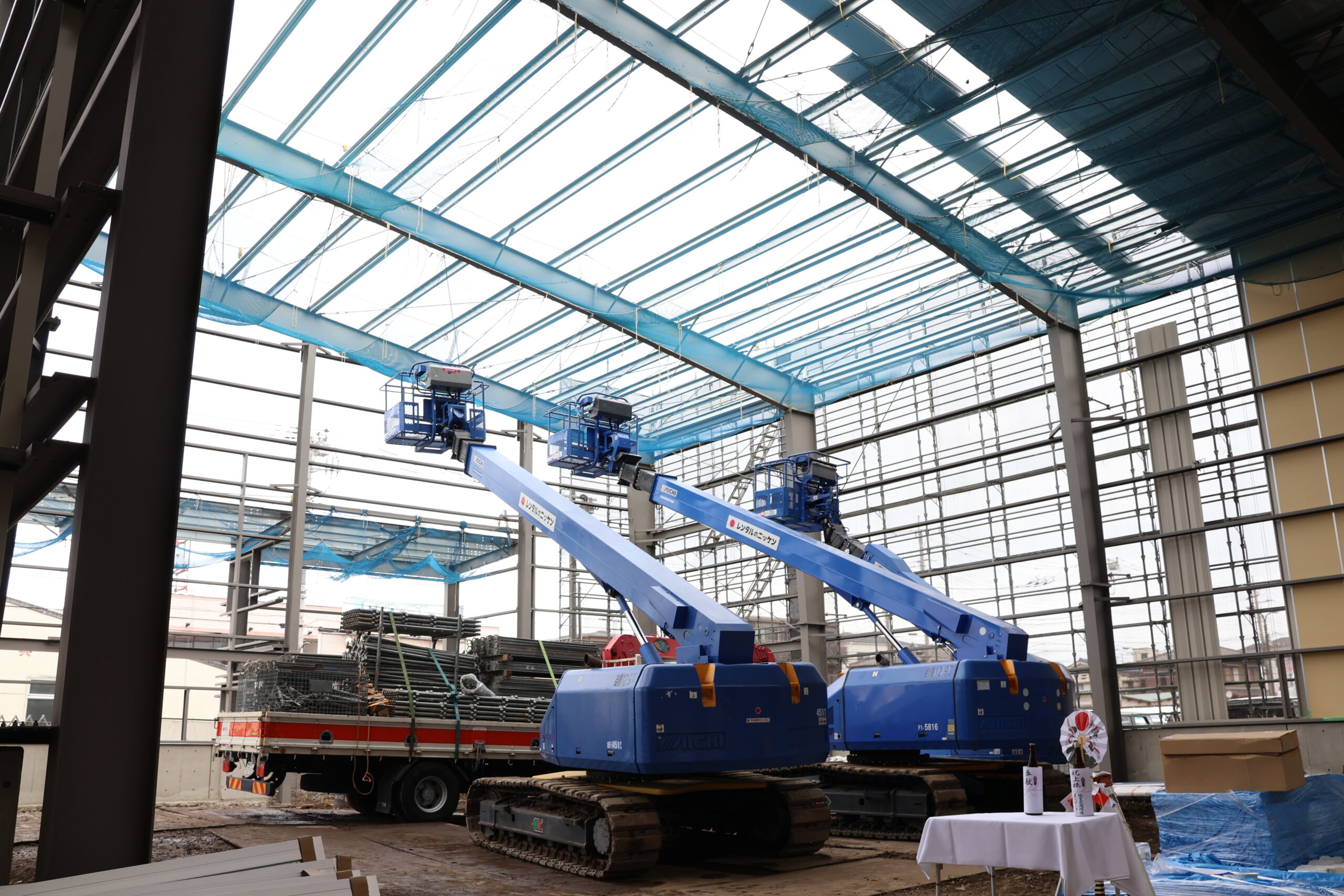 床面にはシートが敷かれ、車両が入り、壁や天井の工事が行われています。