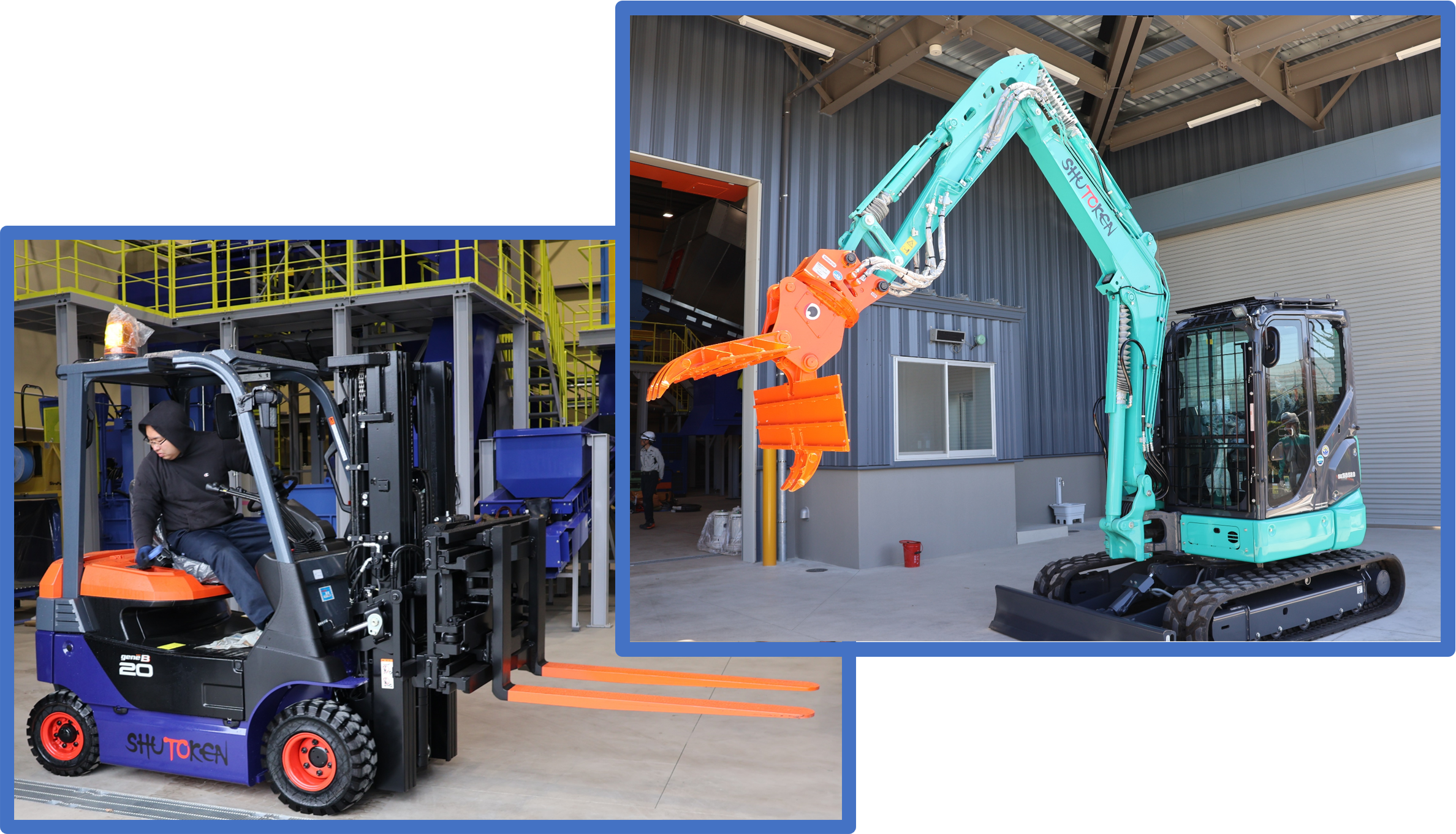 フォークリフト(左)とユンボ(右)です。活躍する様子や楽しいデザインの全てをご見学の際などに見ていただきたいです!